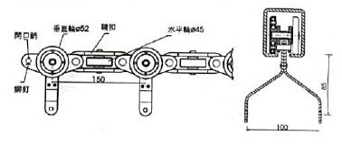此類鏈條是專門為牛皮制品廠設(shè)計(jì)制造之特殊鏈條,結(jié)構(gòu)特點(diǎn)是在標(biāo)準(zhǔn)型鏈條基礎(chǔ)上,固定有特殊形式的吊具,其下面再配以與產(chǎn)品相適應(yīng)的吊掛器械即可完成輸送、空中倉儲(chǔ)、待干等作業(yè)。吊具的間距有150mm、300mm、450mm等不同規(guī)格。